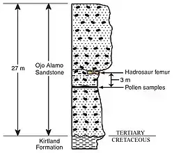 - 1 2 J.E. Fassett; S.G. Lucas; R.A. Zielinski; J.R. Budahn (May 2001). SG Lucas; RA Zielinski; JR Budahn (eds.). Compelling new evidence for Paleocene dinosaurs in the Ojo Alamo Sandstone, San Juan Basin, New Mexico and Colorado, USA, In: Catastrophic events and mass extinctions, Lunar and Planetary Contribution (PDF). 1053. pp. 45–6. Bibcode:2001caev.conf.3139F. Retrieved 2014-08-29.