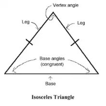 Isoscolese Triangles, as mentioned in Lesson 2, is a triangle that has at least 2 sides that are congruent. The congruent sides of an isoscolese triangle are the legs. The third side is the base. The two legs form the vertex angle. The other two angles are the base angles.