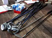 The conventional set of golf clubs includes a driver, a 3-wood, a 5-wood, irons ranging from a 2-iron to a 9-iron, a pitching wedge, a sand wedge, and a putter. Modern variant sets typically replace the 5-wood and 2-iron with a hybrid or rescue club and a lob wedge. Each club in the set is designed to send the ball over successive ranges. The driver typically is used to send the ball 240-260 yards, and many professional players average 280 yards per drive. Each successive club in a set from driver to putter is shorter in length and sends the ball a shorter distance, with the idea that the various distances called for during the round can be played with a appropriate club without much adjustment from its customary range.