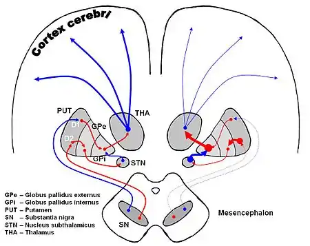 The signals going along the direct pathway have the effect of exciting the output from the thalamus to stimulate action whereas those going along the indirect pathway have the effect of suppressing action. The signals transmitted by dopamine from the substantia nigra pars compactor affect the balance between the two pathways.