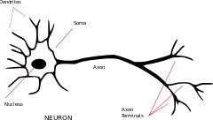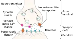 ![]() Fig 1. The axons of neurons in the substantia nigra have proportionately much longer axons than in this diagram because they have to project a long way to reach the striatum | ![]() Fig 2. The axonal terminals of neurons communicate with the dendrites of the receiving neurons by the passage of neurotransmitters across the synapse |
