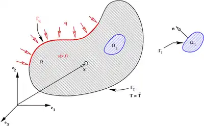 Figure 1 shows a region through which heat is flowing. Points in the medium are represented by with components with respect to the basis and the origin. The heat flux into (or out of) the medium is where is the time. The heat flux takes place across part of the boundary of the medium (). The temperature on the remainder of the boundary () has a known value . Heat sources inside the medium (for example, chemical reactions and plastic deformation) are given as a function .