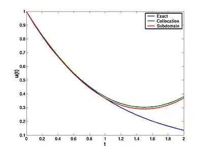You can see that the collocation method gives a solution that is close to the exact up to . However, the same results cannot be used up to without re-evaluating the integrals.
