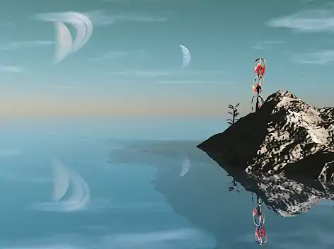 Vue 6 for Macintosh was used to make the images shown below. The image to the left was made after watching the Kickstart tutorial. The Science Fiction/White Dwarf atmosphere was used. The highly reflective liquid option was used for the ocean. A standard terrain element was added, two planets, and two Sci-Fi plant elements. The image was rendered at 640 x 480 pixels on the Ultra quality. The rendered image was sharpened and cropped in Photoshop. Rendering took 15 minutes minutes on a 1.42 GHz G4.