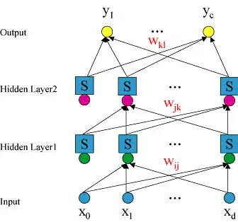 Recall the equations from the NSL back prop lecture. Derive equations for a 3 layer back prop. This can be done by extending a two layer perceptron to three layers the same way a one-layer perceptron is extended to two layers. The figure below shows the schematic of the three-layer perceptron. Define: , , , , , and using the same notation from the NSL slides.