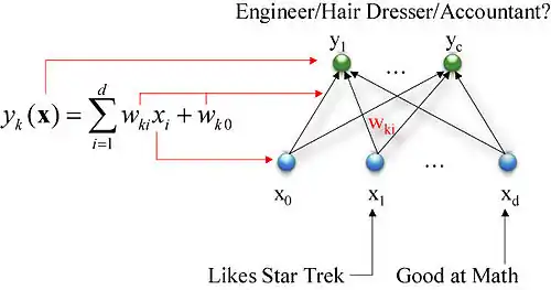 As a side note, single layer perceptrons can be analytically derived in one step. However, we will train this one to illustrate how it is done since, with multi-layer perceptrons, no analytically closed solution is known to exist. We will train the neural network by adjusting the weights in the middle until it starts to produce the correct output. |