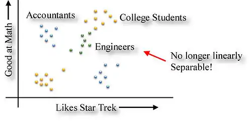 A Perceptron is a type of Feedforward neural network which is commonly used in Artificial Intelligence for a wide range of classification and prediction problems. Here, however, we will look only at how to use them to solve classification problems. Consider the problem below. Suppose you wanted to predict what someone's profession is based on how much they like Star Trek and how good they are at math. You gather several people into a room and you measure how much they like Star Trek and give them a math test to see how good they are at math. You then ask what they do for a living. After that you create a plot placing each person on in based upon their Star Trek and Math scores.