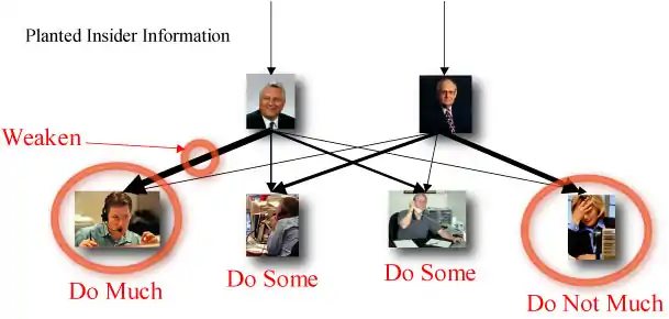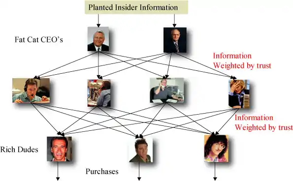 A Mad scientist wants to make billions of dollars by controlling the stock market. He will do this by controlling the stock purchases of several wealthy people. The scientist controls information that can be given by wall street insiders and has a device to control how much different people can trust each other. Using his ability to input insider information and control trust between people, he will control the purchases by wealthy individuals. If purchases can be made that are ideal to the mad scientist, he can gain capital by controlling the market.