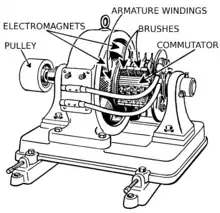 The commutator is one of the most important parts of the DC machine. It is like a rotating switch placed between the armature and the external circuit. It is arranged in such a way that it will reverse the connections to the external circuit at the instant of each reversal of current in the armature coil. The commutator essentially converts alternating current generated in the armature conductors to a unidirectional current. Coomutator is made using high conductivity copper segments seperated by thin layers of mica.