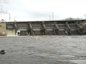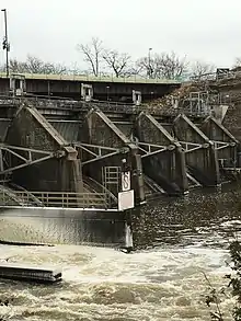 The Tainter gate is a type floodgate used for dams. The design was created by Jeremiah Burnham Tainter. The original design was patented by Thomas Parker on April 13th, 1880[1] but was officially built in 1886. The idea came to Tainter when he wanted to create a water control device to be used on the Red Ceder River. The floodgate would control water levels and help move logs down stream to the Chippewa River and Dunnville. The Tainter gate design has been very successful and is still used today. There are currently 321 Tainter gates being used in the upper basin of the Mississippi River.