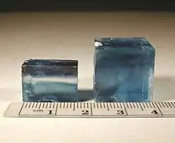Many samples of fluorite exhibit fluorescence under ultraviolet light, a property that takes its name from fluorite.[6] Many minerals, as well as other substances, fluoresce. Fluorescence involves the elevation of electron energy levels by quanta of ultraviolet light, followed by the progressive falling back of the electrons into their previous energy state, releasing quanta of visible light in the process. In fluorite, the visible light emitted is most commonly blue, but red, purple, yellow, green and white also occur. The fluorescence of fluorite may be due to mineral impurities such as yttrium, ytterbium, or organic matter in the crystal lattice. In particular, the blue fluorescence seen in fluorites from certain parts of Great Britain responsible for the naming of the phenomenon of fluorescence itself, has been attributed to the presence of inclusions of divalent europium in the crystal.[7]