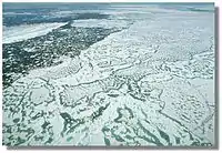 "One example of an ice shelf composed of compacted, thickened sea ice is the Ward Hunt Ice Shelf off the coast of Ellesmere Island in northern Canada. Canadian RADARSAT image shows the shelf in August 2002, when a crack made its way down the length of the shelf."[7]