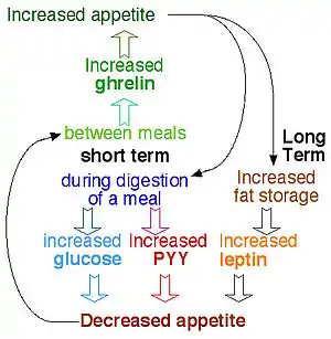 In one model of body weight regulation, insulin acts with leptin (see Figure 3 and below) to modulate the production and action of short-term hormonal regulators of appetite and body weight such as PYY (see Ahima and Antwi). The experience of needing to consume food is not tightly coupled to the storage of energy-rich molecules in the human body. After a meal is digested, blood levels of satiety-inducing hormones like insulin and PYY decrease and ghrelin (a stimulator of appetite, see below) levels increase. Between meals, people often experience a desire to consume more food even when levels of stored energy molecules are adequate. Thus, it is often easy for obese people to gain weight by eating when there is no real need to eat, that is, no actual hunger.