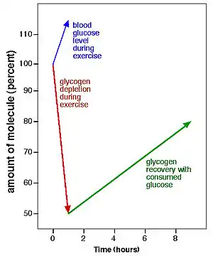 - Glycogen level recovery after exercise. Muscle glycogen recovery after exercise during glucose and fructose intake monitored by 13C-NMR by Adrianus J. Van Den Bergh, Sibrand Houtman, Arend Heerschap, Nancy J. Rehrer, Hendrikus J. Van Den Boogert, Berend Oeseburg, and Maria T. E. Hopman in Journal of Applied Physiology volume 81, pages 1495-1500 (1996). Figure 1 graphically illustrates recovery of glycogen levels using data from Table 1 of Van Den Bergh et al.