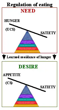 Introduction. We eat food in order to meet the body's need for energy and nutrients. This chapter explores hunger as a source of motivation for eating behavior. Simple models of how eating behavior is controlled assume that the brain can sense and respond to the amounts of energy-rich molecules circulating in the blood and/or stored in parts of the body such as the liver and adipose tissue. It has been hypothesized that hunger is increased by low levels of energy-providing molecules in the body. Eating food reduces hunger and produces satiety. The figure shown to the right on this page illustrates the balance between hunger and satiety. When food is readily available, people often eat when there is no real physiological need to consume food. People learn to eat periodically in anticipation of the body's need for fuel and nutrients. We often have the desire to eat (appetite) when there is no need to eat (hunger).