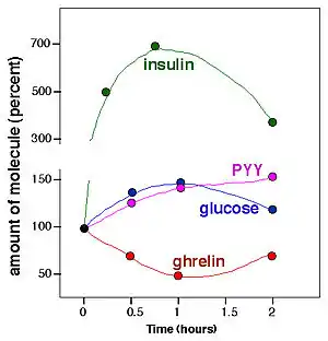 - PYY and ghrelin Weight loss during oligofructose supplementation is associated with decreased ghrelin and increased peptide YY in overweight and obese adults by Jill A. Parnell and Raylene A. Reimer in Am J Clin Nutr volume 89, pages 1751-1759 (2009).