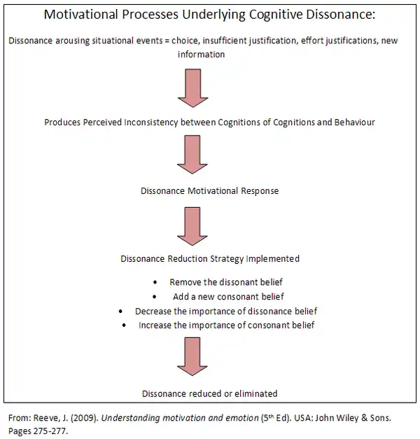- Cognitive dissonance arises when there is a discrepancy between our attitudes and our behaviour. This causes psychological discomfort, which we are motivated to reduce or eliminate (Reeves, 2009).