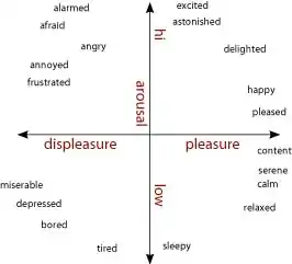 Affective systemBefore reading on, take a moment to answer the question "how you are feeling?" To answer to this question, you likely would have momentarily consciously turned your attention to your internal state before words came to mind that you considered effectively described that state. For example, you might say you are sleepy, relaxed or excited. Core affect can be imagined as a constantly flowing stream of information being collected by your brain providing information about the relationship between you and the world (Russell, 2003). At any time this core affect is consciously accessible (Russell, 2003). There are two dimensions of core affect which combine to produce the affective feeling that leads to emotion: