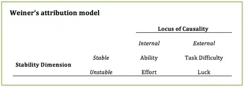 Secondly weiner's attribution theory involves Locus of causality which can be either internal or external, stability which can be either stable or unstable and controllability which can be either controllable or uncontrollable.