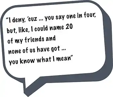A potential campaign would be to encourage women to learn self-defense. A review of rape resistance literature showed that women who used non-forceful tactics (e.g., pleading) were raped 96% of the time and, in contrast rape attempts where women physically resisted dropped 14% to 45% (Morrison, 2005). Another sobering fact is that, although women rate rape as a serious offense, they do not enrol in self-defence classes. Beliefs like those shown in Figure 5 pervade the society and increase women’s perception of invulnerability which places them at a greater risk of sexual assault, as people adhering to such myths end up denying the existence of the threat (Morrison, 2005, p. 240).