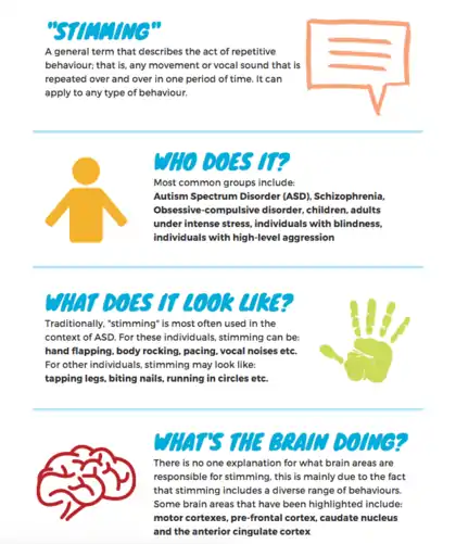 | Stimming is any type of behaviour that involves repetitive physical movements, activities or verbal sounds |