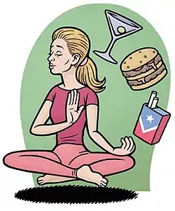 Mental health is defined as an individual's depth of psychological well-being that depends on the functioning of their emotional and behavioural levels (MacDonald, 2006). Mindful eating effects mental health because the satisfaction of controlling mindful eating provides individuals to feel good about themselves (Khan & Zadeh, 2014). This positive mindset benefits mental health because it motivates people to continue mindful eating, as their mindset is clear and has the ability of high awareness (Khan & Zadeh, 2014). A healthy mental health is essential to have under control in order for an accurate thinking pathway, as it shapes the individual in making the best decisions for themselves (Andrews & Wan, 2009). Therefore, mindful eating benefits mental health because it directs individuals in learning the best eating schedule for them that will maintain a better mental health (Taylor et al., 2015). Figure 8 illustrates a woman during meditation, successfully restraining from unhealthy foods. The meditation shows the mental health side of her mindful eating. Mindful eating reduces mental health disorders such as depression and anxiety because the ability to successfully control one's eating tendencies motivates individuals to maintain mindful eating (Miller et al., 2013). This sparks joy in people because it proves to them that they are capable of maintaining a healthy aspect in their daily life through good mental health.