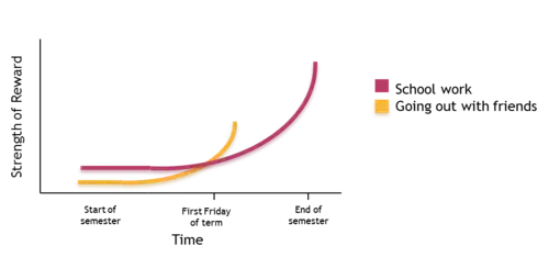 An easy way to understand this theory is by viewing a discount curve map (see Figure 1) which tracks the value of a potential future reward as a function of time. When there are two rewards that are a long way off, the later, larger reward appears a superior option and we work towards that goal. However, when the sooner smaller reward becomes closer its value increases to the point that it overtakes the value of the larger, later reward (Andreou). To put this into an example, consider Jodie, a student who likes to get good grades, but also to socialise. At the start of the semester Jodie decides she is going to study all semester and be rewarded with great grades, however, on the first Friday of term her friends ask her to go out with them that night. Suddenly, the immediate reward of going out with friends has a greater value to Jodie than the distant reward of good grades (which may not even occur – expectancy), so she delays her studying to a later point in time.