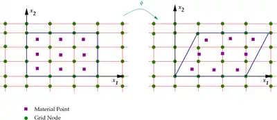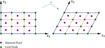 We can think of the Lagrangian mesh as being drawn on the body. The mesh deforms with the body. Both the nodes and the material points change position as the body deforms. However, the position of the material points relative to the nodes remains fixed.