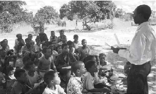 Figure 2: A teacher teaching his class in Mozambique under the tree (no classroom)