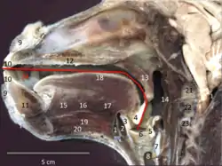 The fourth image down on the right shows an anatomic sagittal view of the head of a female baboon with vocalization organs labeled: "(1) hyoid bone, (2) air sac, (3) thyroid cartilage, (4) epiglottis, (5) arytenoid cartilage, (6) vocal folds and glottis, (7) cricoid cartilage, (8) trachea, (9) lips, (10) incisors, (11) mandible, (12) hard palate, (13) velum, (14) pharyngeal wall, (15-16-17) anterior GGa, medial GGm, and posterior genioglossus GGp,(18) superior longitudinalis, (19) geniohyoid GH, (20) digastric anterior, (21) C1, (22) C2,(23) C3, (24) mid sagittal line of the vocal tract used to infer the tract length and the computation of the MAS. Note the orientation of the fibers of the GGa, GGm and GGp muscles, which approach vertical on the anterior part of the tongue but are effectively horizontal in the posterior part. The fibers of the styloglossus (SG) muscle on the lateral sides of the tongue have approximately the same inclination as those of a human baby [10]. As in humans, the hyoglossus (HG) muscle has two components which are inserted into the body of the hyoid bone and over the entire extent of the great horn. Its fibers are oriented vertically as found in human children. (N.B.: SG and HG are both lateral to the midline, and do not appear on this view.) This anatomical study shows that a baboon’s tongue has the same musculature as a human’s. Regarding shape and proportions, the baboon’s tongue is more similar to that of a child than that of a human adult."[13]
