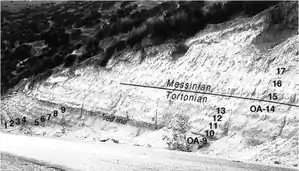 {{fairuse}}"The GSSP of the Messinian Stage, which per definition marks the base of the Messinian and, hence, the boundary between the Tortonian and Messinian Stages of the Upper Miocene Subseries, is Oued Akrech (Morocco) where the Messinian GSSP is now formally designated at the base of the reddish layer of sedimentary cycle no. 15. This point coincides closely with the first regular occurrence (FRO) of the planktonic foraminiferal Globorotalia miotumida group and the first occurrence (FO) of the calcareous nannofossil Amaurolithus delicatus, and falls within the interval of reversed polarity that corresponds to C3Br.1r. The base of the reddish layer and, thus, the Messinian GSSP has been assigned an astronomical age of 7.251 Ma."[29]