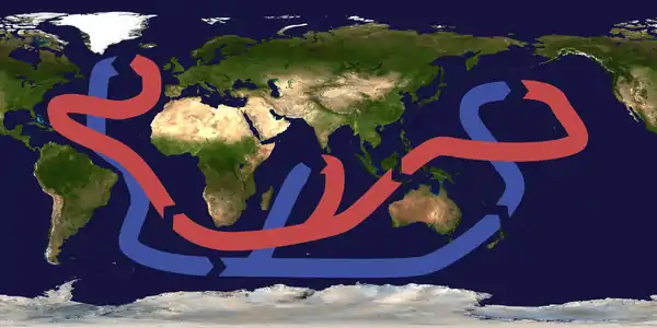 The temperature of the oceans is not a constant, nor is it uniform throughout the oceanic mass. Sunlight imparts its energy to the ocean surfaces all summer long, and in response the ocean heats and holds that energy. Once winter comes, the oceans release that warmth back into the atmosphere in accordance with their heat capacity. This is why it is warmer near the coast in winter, and cooler in summer. Just as the ocean may act as climate control for a local area, the oceans provide convective heat transfer as they circulate, providing climatic adjustment for every latitude via the Thermohaline Circulation. These currents are responsible for the cool weather along the US Atlantic coast, and the balmy high-latitude climate of the Mediterranean. The oceans in the Northern hemisphere are usually warmer in January, long after the summer has passed, and coolest in April, after most of their heat has been given off to the cold winter skies.
