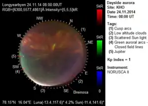"Though cusp auroras are not particularly rare, they are often difficult to spot because they only happen during the day, when sunlight usually drowns out what would otherwise be a spectacular light show. However, because the magnetic North Pole is offset from the geographic North Pole, it’s often possible to see cusp auroras in Northern Europe near the winter solstice."[15]