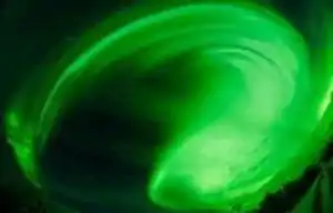 {{fairuse}}On the right is an image of a yellow-brown, ground-touching aurora that may be more than just due to electrons.