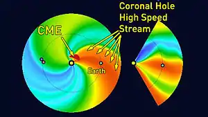 "The wide band of yellow-orange-red, with Earth's dot is right smack dab in the middle of it, is that fast stream of solar particles - a region of the solar wind called a "coronal hole high speed stream" (CH HSS). The reason why the particles of the solar wind are moving so quickly in this region is because they're traveling through space that has been 'swept clear' of other particles by a band of denser solar plasma that swept past us earlier in the week."[10]