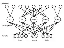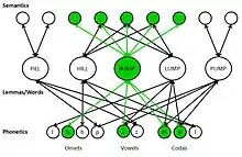 These models consist of a vast network of nodes categorized into one of three basic types, semantic nodes, word (or lemma) nodes and phonological nodes. These nodes are all interconnected, and function on the principle of spreading activation (Levelt, 1999). In speech production, first the intended semantic nodes are activated. These nodes contain the meaning or concept that is eventually going to be conveyed. Those semantic nodes will then in turn activate appropriate lemma nodes that contain the words best capable of conveying the intended concepts. Those lemma nodes then in turn activate the phonological codes that make up the words. Because the nodes are all vastly interconnected, the activation does not proceed linearly. The activation of the desired concepts will in turn activate other concepts that are related to those concepts, which will then in turn activate all of the lemma nodes associated with those newly activated concepts, which results in the activation of the phonological nodes connected to each of those lemma nodes as well. Because of this widespread activation, word choice in this model depends not on which nodes are activated, but on how much those nodes are activated.