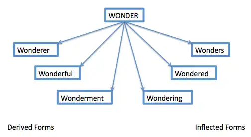 Morphemes are the smallest (formal) units of meaning in a word. For example, the word “cleaner” is composed of two morphemes “clean” (verb) and “er” (one who performs verb). These form-meaning overlaps are consistent and generally operate in a rule-like way, causing some to suggest that the mental lexicon may be organized (at least in part) by these rules. The first study to support this idea was by Stanners and colleagues’ (1979) (Stanners, Neiser, Hernon, & Hall, 1979)[14]. They reported priming, or faster reaction times, for words that were preceded by their inflected past tense, “ed,” forms compared to those that were preceded by their irregular past-tense form. Then, in in a series of lexical decision, masked priming tasks (Forster & Davis, 1984)[15], Marlsen-Wilson and colleagues (1994) found aural-visual priming for root words preceded by one of their (morphologically) derived forms compared to orthographically and semantically related pairs. The conclusion from studies such as these is that words that share a morphological root may be organized under that root in the mental lexicon, at least for monolinguals (see Figure 6). Some researchers are even beginning to ask now whether this morphological mental organization holds true across languages for bilinguals, but results are still far from conclusive (Voga & Grainger, 2007)[16]. As for words that appear to share a root, but actually do not (e.g., “corn” and “corner”), it is suggested that these are organized in their own, separate lexical groups. Finally, irregular past-tense forms of verbs are also supposed to be organized separately, not under the present-tense form of the verb, meaning that irregular words must me memorized as whole-words (Pinker, 1991)[17].
