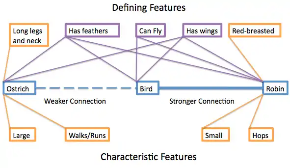 To address some of the shortcomings of models like Collins and Quillian’s (1969), Smith and colleagues (1974) developed a model that viewed the meanings of words as sets of semantic features or attributes (Smith et al., 1974). These features can be broken down into two types: characteristic and defining. Defining features are ones that are essential to distinguishing a concept from others (e.g., their most salient feature), while characteristic features are ones that are not essential to this. For example, a defining feature of “robin” is that it is “red-breasted,” while a characteristic feature is that it is "small.” The more defining features concepts share, the closer together they are organized in the mental lexicon. Thus, looking at the defining features shared between “bird,” “robin,” and “ostrich,” we see that “robin” and “bird” share 3, while “ostrich and “bird” share 2, meaning that “robin” would be grouped closer to “bird” than “ostrich” (see Figure 2). A hierarchical model, by contrast, would organize “ostrich” and “robin” equally close to “bird.” Thus, this model allows for more flexibility and levels in connections between nodes (lexical entries). Another key aspect of this model is that the more concrete a concept is, the more defining features it has, and the easier it is to make a semantic decision about it when compared with another concept. For example, when performing a semantic categorization task, it is easier to make a decision about the question, “Is a dog a toaster?” than, “Is an animal a thinker?”