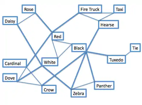 Collins (and Loftus) also addressed some of the shortcomings of his (and Quillian’s) (1969) earlier hierarchical model (Collins & Loftus, 1975)[7]. They explained some of the misconceptions people had about this model and adapted it to make it more flexible. This involved breaking down the rigid hierarchy so that direct connections could be formed between any two nodes (lexical entries). While doing this had the effect of making the model look more like the Semantic Features Model of Smith et al., (1974), it was different in that it did not rely solely on semantic feature comparison. In this revised model, objects (e.g., fire truck), features (e.g. red), verbs (e.g., eat) and even the links between all of these are treated as concepts, with distinct nodes. Any two words can be linked together, without any intermediate nodes, and the thickness (or sometimes length) of the link determines how closely organized together those concepts are (see Figure 3).