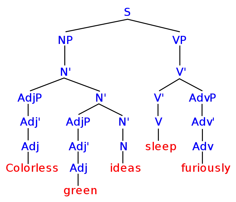 Syntactic categories are another way of classifying words. All languages have syntactic categories. There are three clearly defined categories: nouns, verbs and adjectives. There are also numerous other small categories, like prepositions, determiners, articles, adverbs, conjunctions, etc. that are a matter of great debate among linguists and vary more cross-linguistically. Categories are usually taught based on their members (e.g. a noun is a person, place or thing, a verb is an action word), but are more accurately determined based on their role in a sentence. A noun is the only category that can be the subject of a sentence, or the object of a verb, as in “The dolphin ate the fish,” where “dolphin” and “fish” are the subject and object, respectively. A verb is the only category that can dictate what other positions must be filled for a sentence to be complete, as in “I gave the cake to my mom,” where the verb “gave” requires a subject, direct object and indirect object. All sentences have a verb, even one-word sentences like “Go!” where there is no noun in subject position (although semantically there is still a subject, it is just a rule of English that grammatical subject is not realized in syntax for verbs in the imperative mood). This tree diagram shows a simple sentence composed of a noun phrase and a verb phrase. Notice how even though the sentence doesn't make any sense, it is still grammatical because each position is filled by a word of the right syntactic category. The word category is labelled for each word, and all are open-class words.