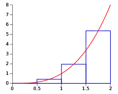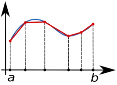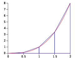In Fig. b the curve is replaced by straight-line segments, creating a collection of trapezoids whose total area exactly equals the area shaded in Fig. a. These straignt-line segments are barely distinguishable from the smooth curve in Fig. b, with red showing the areas of negative curvature where the segments lie beneath the curve, and blue showing where the segments lie above the curve because the curve as positive curvature. These red and blue areas were created using the fill feature of Inkscape and are only approximately correct. The grey square represents an area of 1 unit, and the gray rectangle has an area of 1/12. The net area of the four red shapes (minus the one blue shape) can be seen to be approximately 1/12.