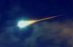 A fireball is a brighter-than-usual meteor. The International Astronomical Union defines a fireball as "a meteor brighter than any of the planets" (magnitude −4 or greater).[2] The International Meteor Organization (an amateur organization that studies meteors) has a more rigid definition. It defines a fireball as a meteor that would have a magnitude of −3 or brighter if seen at zenith. This definition corrects for the greater distance between an observer and a meteor near the horizon. For example, a meteor of magnitude −1 at 5 degrees above the horizon would be classified as a fireball because if the observer had been directly below the meteor it would have appeared as magnitude −6.[3]