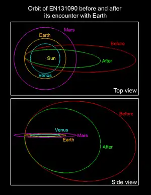The atmospheric pass modified the object's mass and orbit around the Sun, but it is probably still in an Earth-crossing orbit and passed close to Earth again in August 1997.[65]