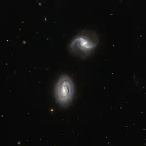 "Both are spiral galaxies, and are presented to our eyes face-on, so we are able to appreciate their distinctive shapes. On the left of the image, spiral galaxy PGC 9074 shows a bright bulge and two spiral arms tightly wound around the nucleus, features which have led scientists to classify it as a type Sa galaxy. Close by, PGC 9071 — a type Sb galaxy — although very similar and almost the same size as its neighbour, has a fainter bulge and a slightly different structure to its arms: their coils are further apart."[15]