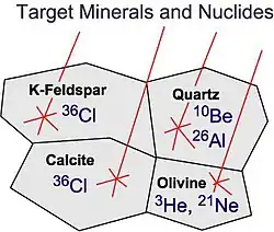 "Nuclear interactions between neutrons and muons and minerals [as in the diagram at the right] such as quartz, calcite, K-feldspar, and olivine, produce long-lived radionuclides such as Be-10, Al-26 and Cl-36."[5]