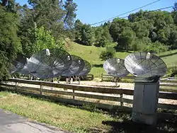 "This composite picture [at right] shows the radio sky above an old optical photograph of the NRAO site in Green Bank, WV. The former 300 Foot Telescope (the large dish standing between the three 85 foot interferometer telescopes on the left and the 140 Foot Telescope on the right) made this 4.85 GHz radio image, which is about 45 degrees across. Increasing radio brightness is indicated by lighter shades to indicate how the sky would appear to someone with a "radio eye" 300 feet in diameter."[6]