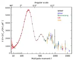 {{free media}}The figure at the right "shows the three-year WMAP spectrum compared to a set of recent balloon and ground-based measurements that were selected to most complement the WMAP data in terms of frequency coverage and l range. The non-WMAP data points are plotted with errors that include both measurement uncertainty and cosmic variance, while the WMAP data in this l range are largely noise dominated, so the effective error is comparable. When the WMAP data are combined with these higher resolution CMB measurements, the existence of a third acoustic peak is well established, as is the onset of Silk damping beyond the 3rd peak."[16]