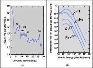 "The relative abundances of GCR particles (9) are shown in [the figure on the right] (a), and typical energy spectra (10), are shown in [...] (b). The GCR particles of interest for radiation protection of crews engaged in space exploration range from protons (nuclei of hydrogen) to nuclei of iron; the abundances of heavier elements are orders of magnitude lower."[14]