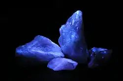 Many samples of fluorite exhibit fluorescence under ultraviolet light, a property that takes its name from fluorite.[5] Many minerals, as well as other substances, fluoresce. Fluorescence involves the elevation of electron energy levels by quanta of ultraviolet light, followed by the progressive falling back of the electrons into their previous energy state, releasing quanta of visible light in the process. In fluorite, the visible light emitted is most commonly blue, but red, purple, yellow, green and white also occur. The fluorescence of fluorite may be due to mineral impurities such as yttrium, ytterbium, or organic matter in the crystal lattice. In particular, the blue fluorescence seen in fluorites from certain parts of Great Britain responsible for the naming of the phenomenon of fluorescence itself, has been attributed to the presence of inclusions of divalent europium in the crystal.[6]