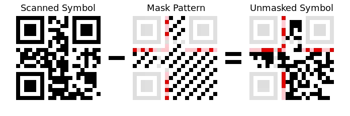 The masking transformation is easily applied (or removed) using the exclusive-or operation (denoted by a caret ^ in many programming languages). The unmasking of the format information is shown below. Reading counter-clockwise around the upper-left locator pattern, we have the following sequence of bits. White modules represent 0 and black modules represent 1.